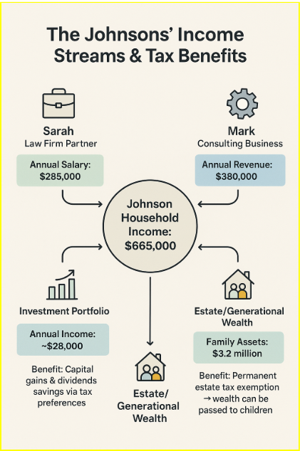 Sarah Johnson embodies the kind of high earner the bill was designed to reward. At 42, she earns $285,000 as a law firm partner, while her husband Mark adds $380,000 from his consulting firm—their combined income of $665,000 places them comfortably in the top one percent of American households³.