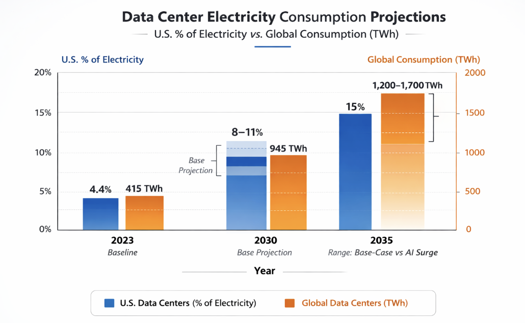 Data center electricity use is rising quickly. In the U.S., data centers used about 4.4% of all electricity in 2023, a share expected to increase to 8–11% by 2030 and potentially 15% by 2035 (DOE, 2023; Global Efficiency Intelligence, 2025). Globally, they consumed roughly 415 TWh in 2024, and the IEA projects this could more than double to 945 TWh by 2030 and reach 1,200–1,700 TWh by 2035, depending on AI expansion (IEA, 2025). AI is the main driver of this surge, with electricity demand from AI‑optimized data centers expected to more than quadruple by 2030 (IEA, 2025). In the U.S., data centers are projected to account for nearly half of all electricity demand growth over this period (IEA, 2025).