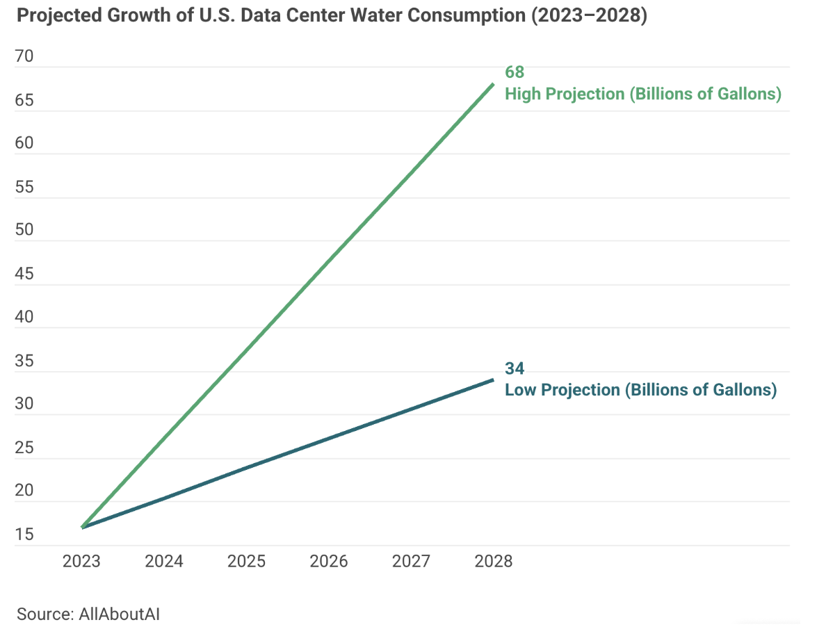 The trajectory over the next decade is alarming. Indirect water consumption tied to data center electricity generation in the U.S. is projected to nearly double from 54 billion gallons in 2025 to 91 billion gallons by 2030 (Bluefield Research, 2025). One analysis projects that U.S. data centers could require up to 1 trillion gallons of water annually by 2030 (Bluefield Research via Brookings, 2025). A peer-reviewed study published in 2025 found that without mitigation, global water consumption associated with data centers could increase more than sevenfold by mid-century (ScienceDirect, 2025). The carbon footprint of AI systems alone could generate water consumption equivalent to between 312.5 and 764.6 billion liters in 2025, roughly the amount New York City uses in five months (ScienceDirect, 2025).